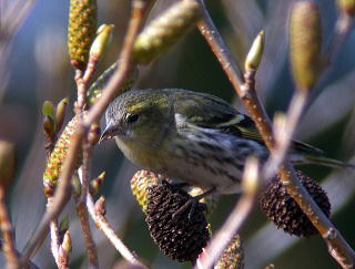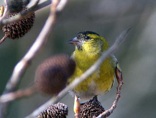 マヒワがヤシャブシ(オオバヤシャブシ?)の実を食べにきました。雄が2、雌が1居ますが、「ぱっ」と見ても分かりません。