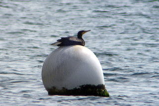 なかなか鳥がいない中、大きな浮き玉の上で休憩するカワウ。