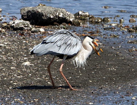 サギはボラを咥えたこの個体が近づくと、皆逃げてしまいます。