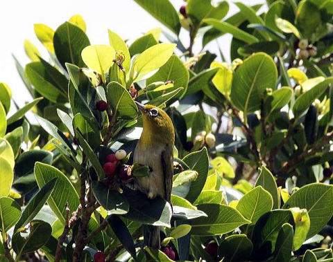 こちらのメジロも木の実をパクリ。大きな口をあけていました。ちょうど繁殖期で、幼鳥連れが目立ちました。