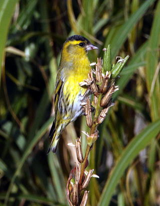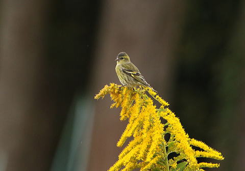 黄色いセイダカアワダチソウの上に乗ったマヒワ。