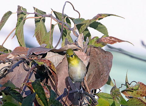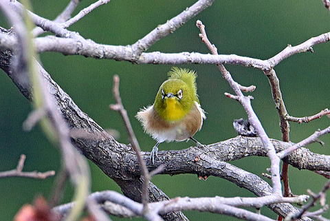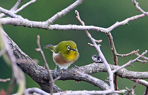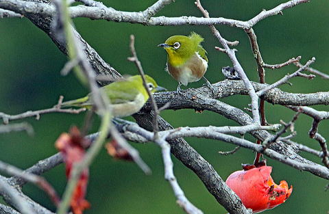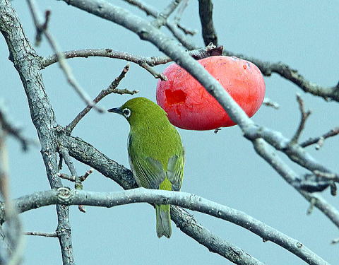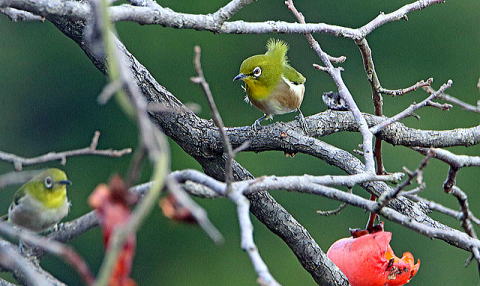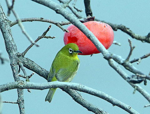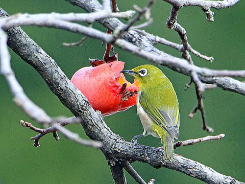 こちらのメジロさん、自宅近くのカキの木での写真。飛んできて誰