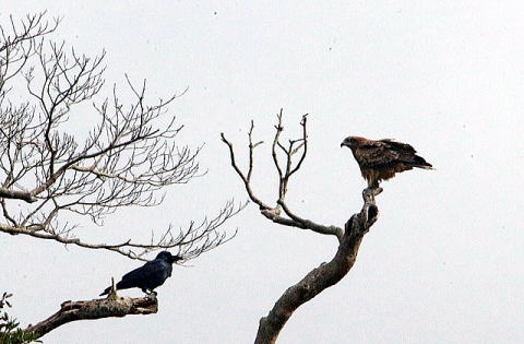 前回と同じく、同じ「見張り台」でトビとカラスのにらみ合い。当然