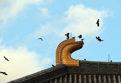 カラスたちは東大寺の屋根の近くで風に乗って遊んでいるのです。